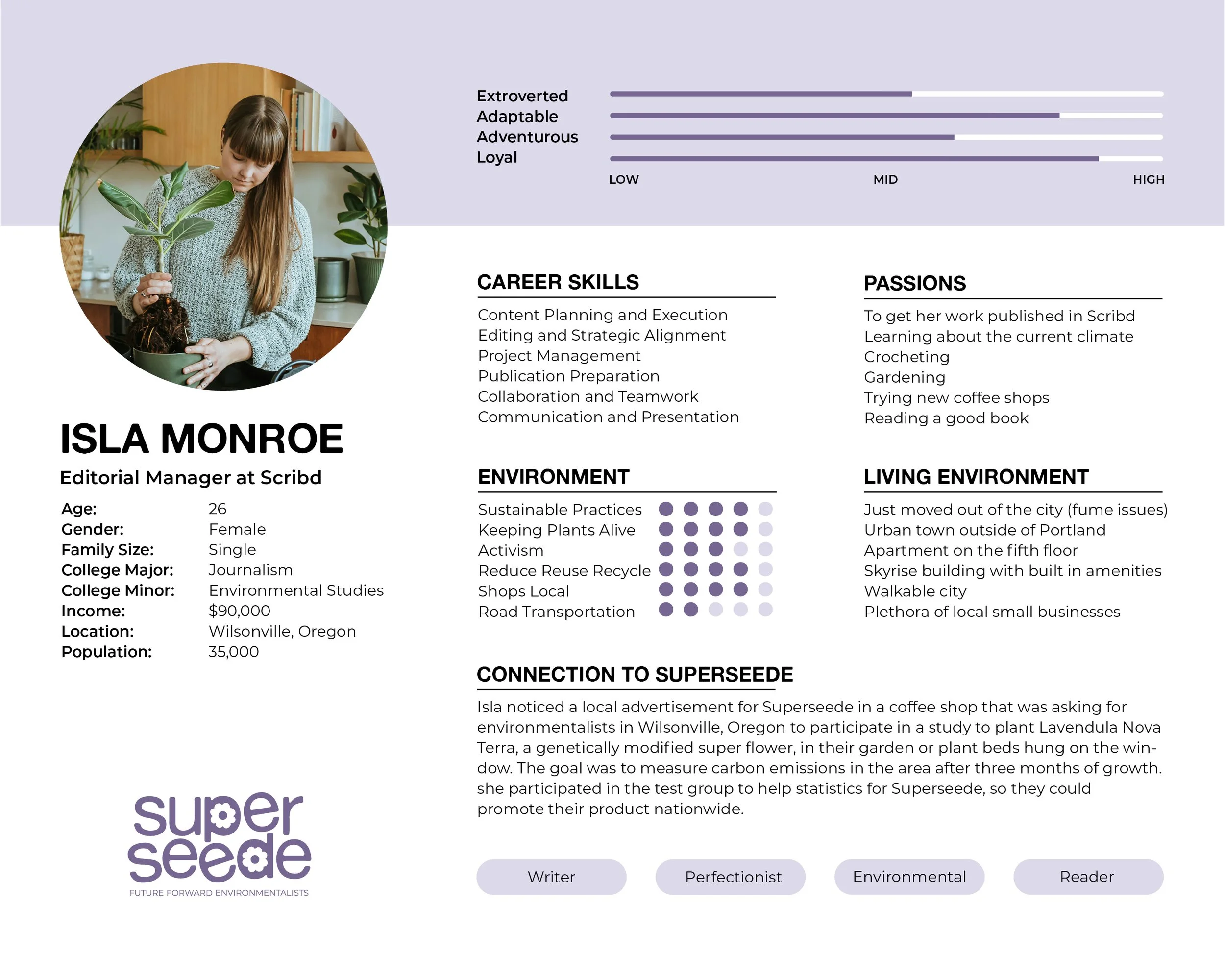 The company, Superseede, noticed that one of the leading drivers of climate change was fossil fuels. Their initiative highlights the catastrophic effects we could face by 2100 if action is not taken starting in 2075. The original experiment began in 2035, and by 2073, it was ready to be tested across three environmentally diverse regions of Oregon. The goal was to create a world where living energy, born from genetically engineered flowers, superseded fossil fuels, restoring balance to the planet and empowering a future fueled by nature, not destruction.